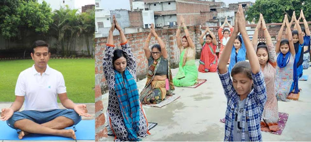 आजमगढ़ -- छठवें अंतरराष्ट्रीय योग दिवस के अवसर पर कोविड-19 महामारी से बचाव के दृष्टिगत सामाजिक दूरी के नियमों का अनुपालन करते हुए अपने-अपने घरों में लोगों ने योगाभ्यास कर योग दिवस को मनाया। वहीं जिलाधिकारी राजेश कुमार ने अपने आवास पर प्रातः 7:00 से 8:00 तक योग कर जन- सामान्य को योग के प्रति प्रेरित किया। उन्होंने कहा कि सभी को अपने दैनिक जीवन शैली में योग को अपनाना चाहिए, योग करने से हमारे शारीरिक और मानसिक विकारों का नाश होता है तथा अद्भुत ऊर्जा की प्राप्ति होती है। इसी के साथ ही साथ आज अन्य अधिकारियों व जन-सामान्य द्वारा भी अपने-अपने घरों में योग किया गयाl विश्व योग दिवस के अवसर पर योग मंच के योग गुरु जनपद की ख्याति प्राप्त योग प्रशिक्षक देवविजय यादव ने अपने पूरे परिवार के साथ अपने आवास पर योग दिवस के योग प्रोटोकॉल का विस्तृत अभ्यास किया प्रोटोकॉल के अनुसार पांच खड़े होकर ,पांच बैठकर ,पांच लेट कर, तीन पेट के बल लेटकर, और 4 पीठ के बल लेट कर कुल 21 आसनों का अभ्यास किया गया। इस अवसर पर देव विजय यादव ने बताया कि योग प्राणायाम करने से कार्य करने की क्षमता दोगुनी हो जाती है योग जीवन का सार है सुबह-सुबह एक घंटा योग करने से शरीर व मन स्वस्थ रहता है शरीर में ऊर्जा व स्फूर्ति का संचार हमेशा बना रहता है अंतर्राष्ट्रीय योग दिवस पर नारी शक्ति संस्थान द्वारा वचुअर्ल योग शिविर का आयोजन किया गया। जिसमे नारी शक्ति ने सामाजिक दूरी का पूर्णतया ध्यान रखते हुए अपने अपने घरों में ही ऐप के माध्यम से आनलाइन होकर जमकर योग का आनंद लिया। इस दौरान सचिव डा पूनम तिवारी ने बताया कि भारत के ऋषि-मुनियों ने योग साधना को पूरे विश्व को परिचित कराया था वर्तमान समय में भारतीय प्रधानमंत्री ने योग दिवस के रूप में वैश्विक स्तर पर पहचान दिलाकर भारत को फिर से विश्व गुरू बनाने का कार्य किया है।