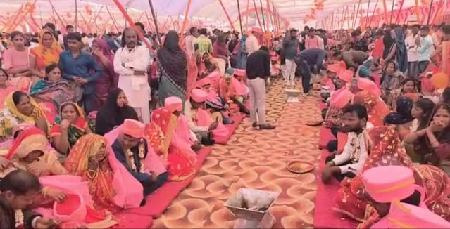 आजमगढ़: दिन-मंगलवार।शहर का आइटीआइ मैदान। आयोजन-मुख्यमंत्री सामूहिक विवाह समारोह। आकर्षक ढंग से मंडप सजा था। शहनाई की मधुर ध्वनि के बीच घराती- बाराती पक्ष का आवाभगत हो रही थी। शादी का शुभ समय आते ही वर-वधू ने एक दूसरे के गले में वरमाला डाली। 486 में 483 जोड़ों की वैदिक रीति-रिवाज से शादी कराई गई। जबकि तीन मुस्लिम जोड़ों का निकाह काजी ने कराया। महिलाओं ने शादी के मंगलगीत गाए। शादी होने के बाद जनप्रतिनिधियों और अधिकारियों ने नव दंपती के सुखी जीवन के लिए आशीर्वाद दिया। समाज कल्याण विभाग की तरफ से दिए गए उपहार के साथ दुल्हन पिया के घर रवाना हो गईं। मुख्य अतिथि एमएलसी विजय बहादुर पाठक, भाजपा जिलाध्यक्ष लालगंज ऋषिकांत राय, भाजपा नेता अरविंद जायसवाल, संतोष सिंह टीपू, मनोज यादव, भाजपा एससी-एसटी प्रकोष्ठ के सदस्य तीजा राम, सीडीओ आनंद कुमार शुक्ला, जिला समाज कल्याण अधिकारी मोती लाल, जिला अल्पसंख्यक कल्याण अधिकारी शशांक सिंह, जिला प्रोबेशन अधिकारी बीएल यादव, आलोक कुमार मिश्र आदि थे।
